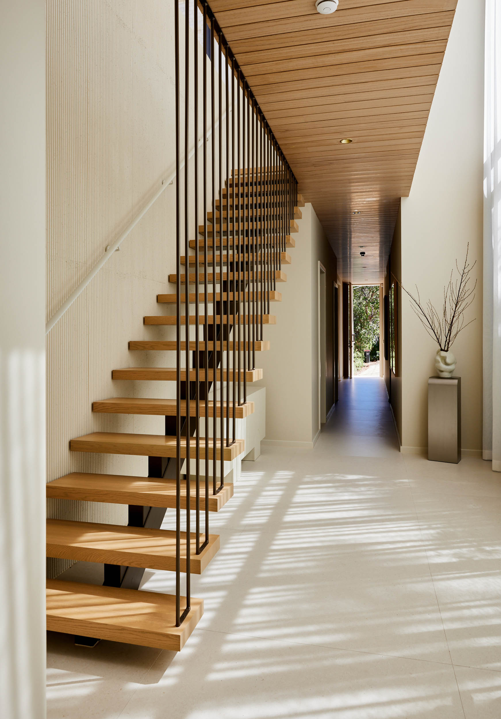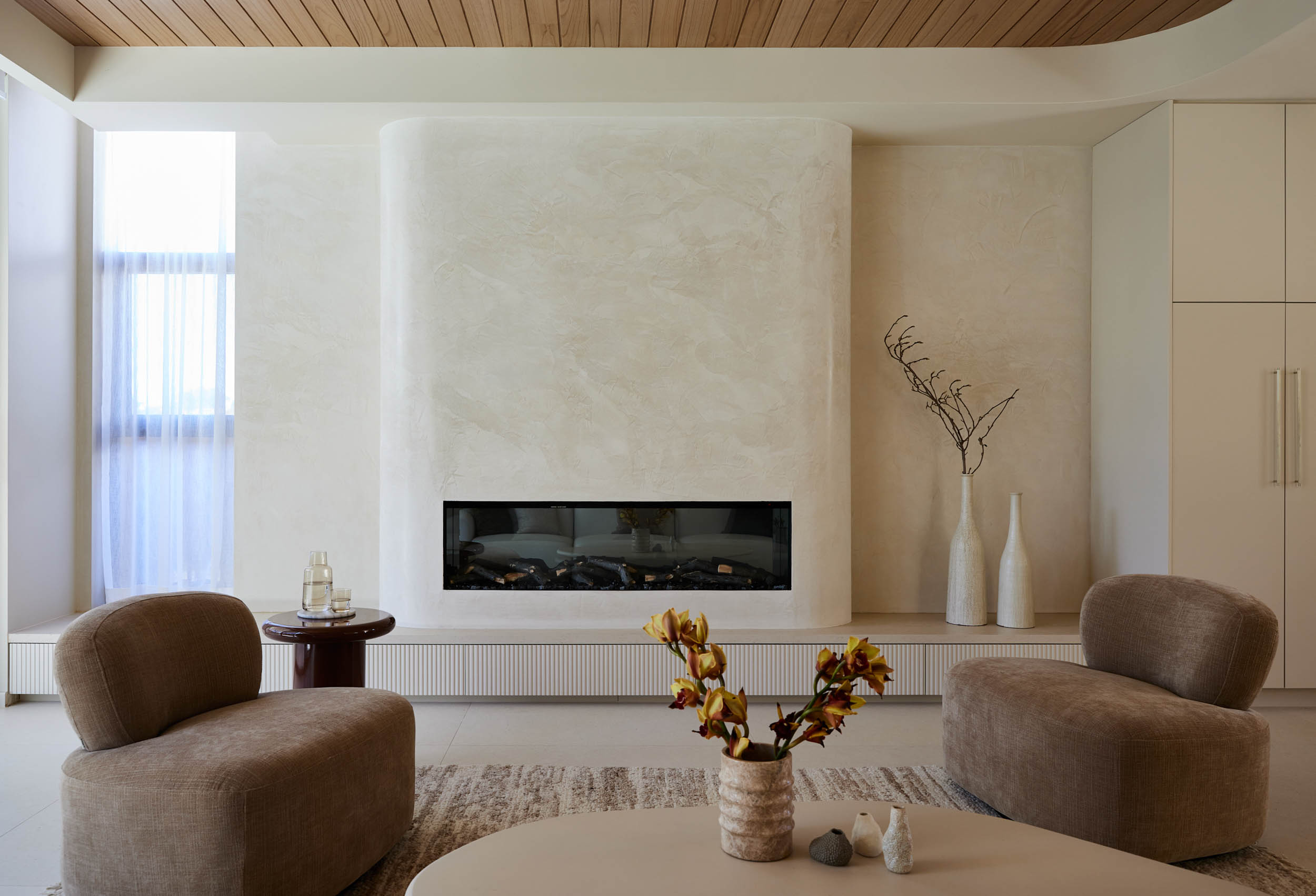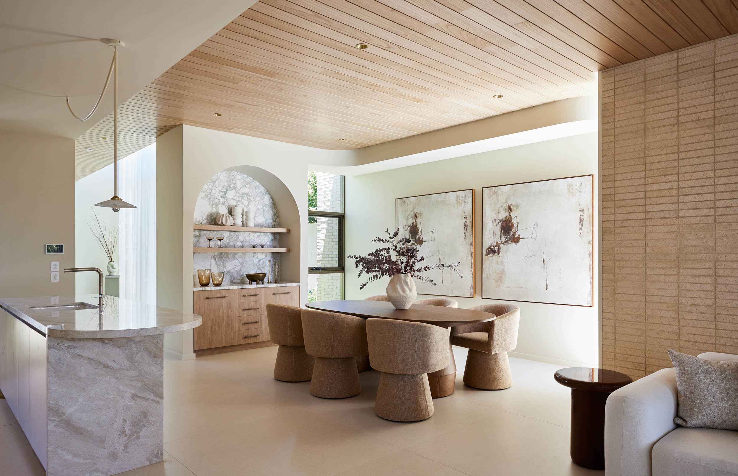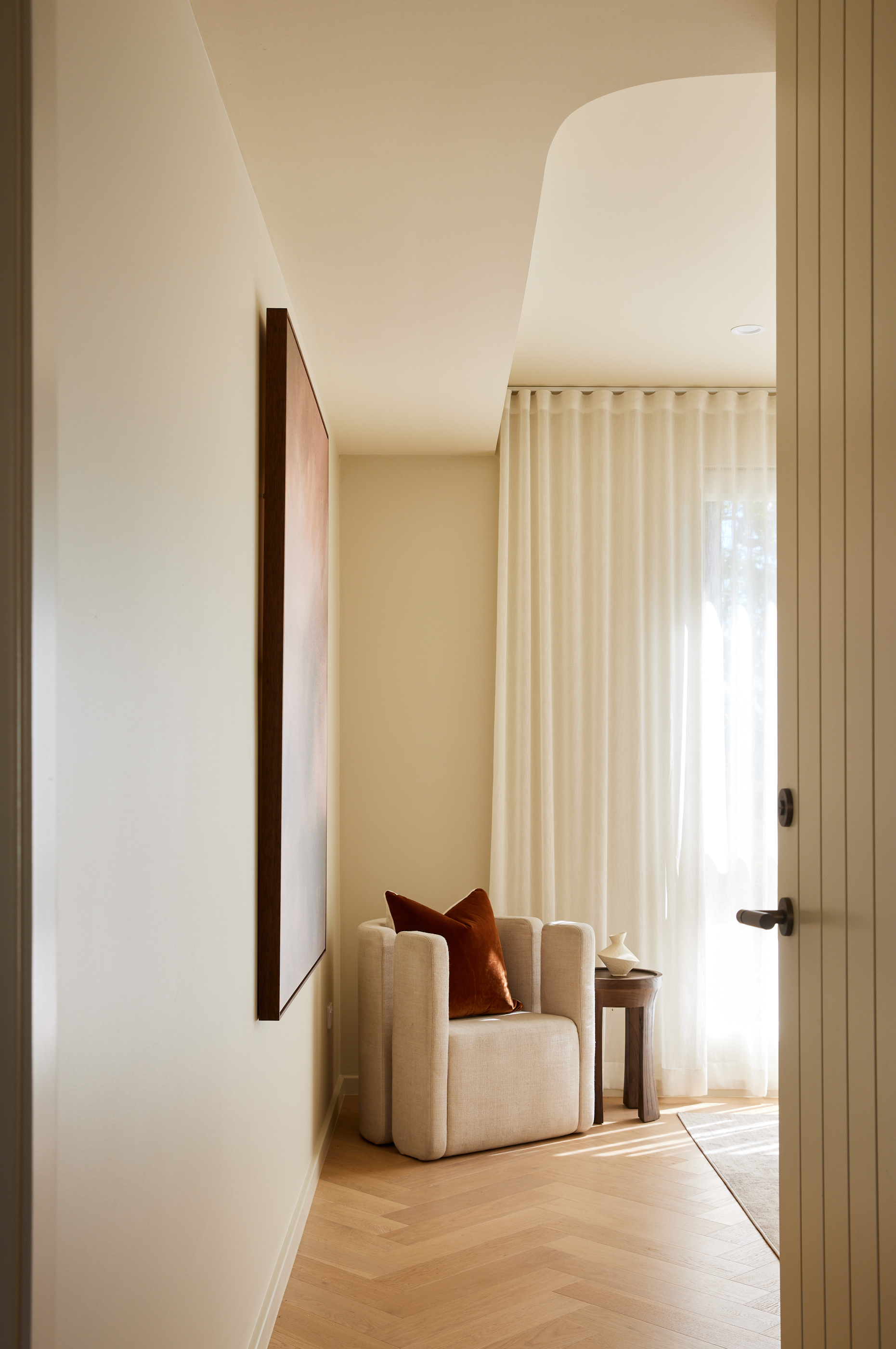 The interior is layered and contemporary, defined by warm neutral tones, timber, concrete and warm metal detailing. Dulux Grand Piano Quarter is used throughout to cocoon the home in a tranquil atmosphere. Integrated storage, sculptural lighting and tactile finishes create a calm, luxurious residence designed for modern living.