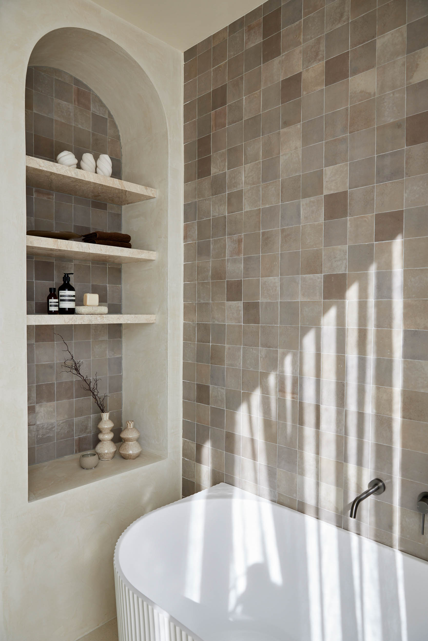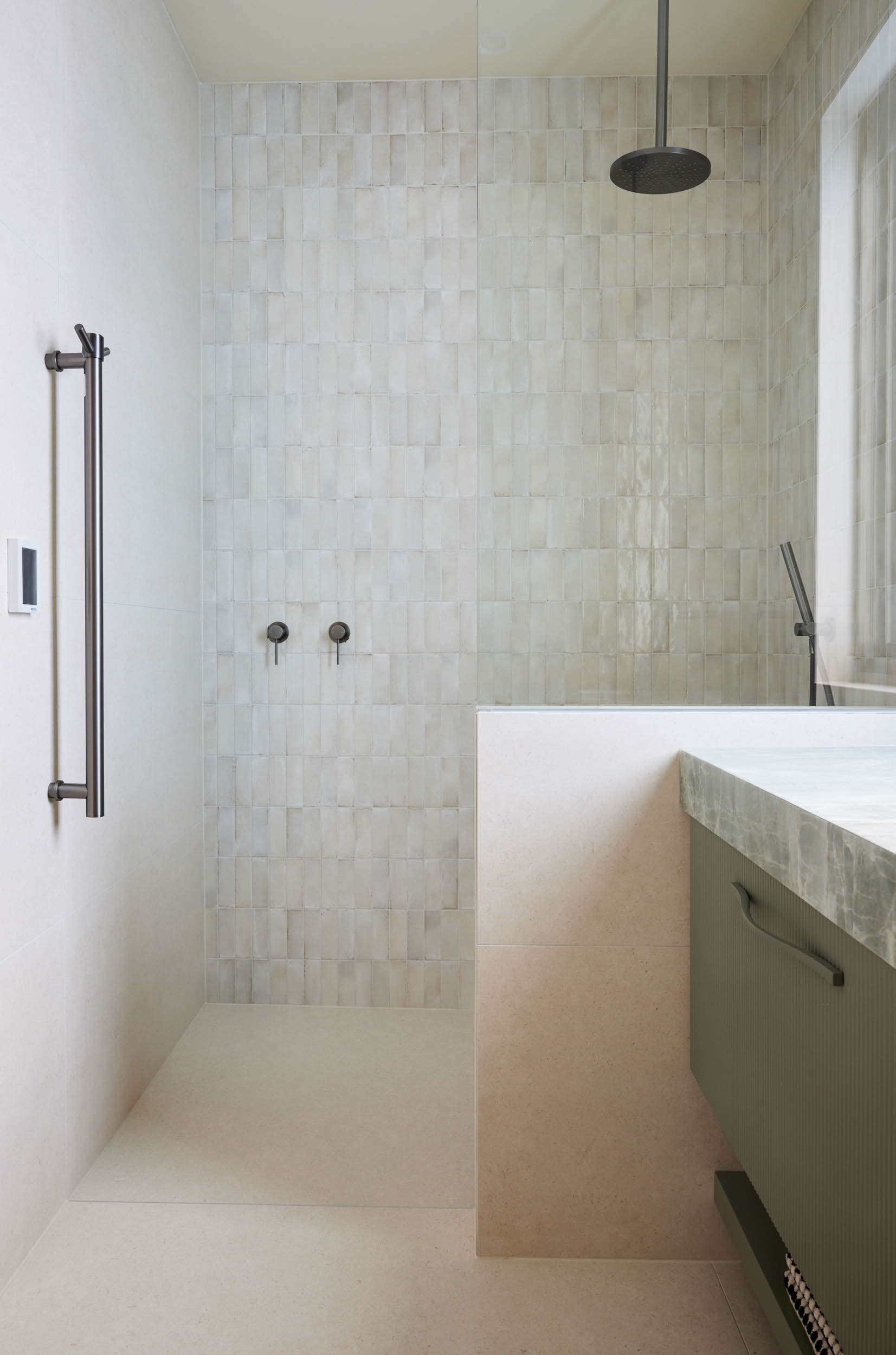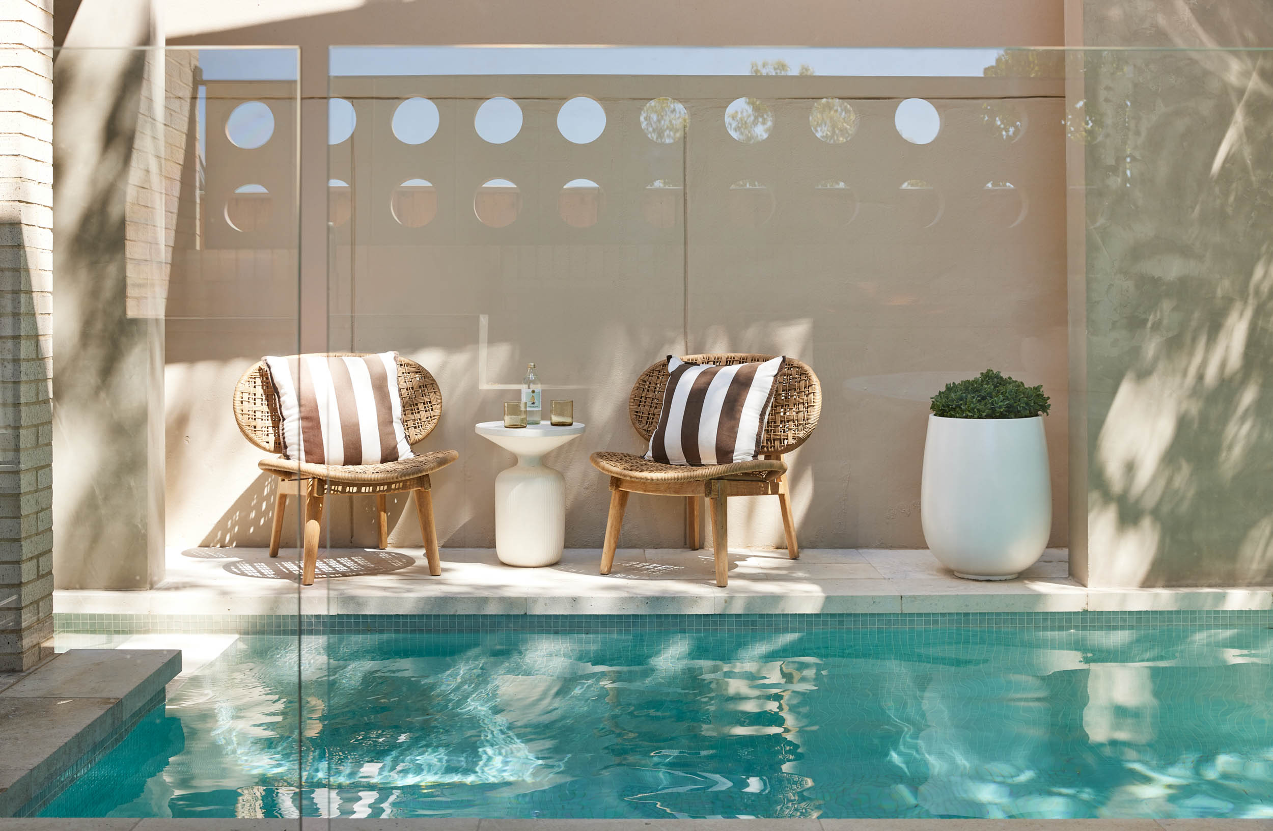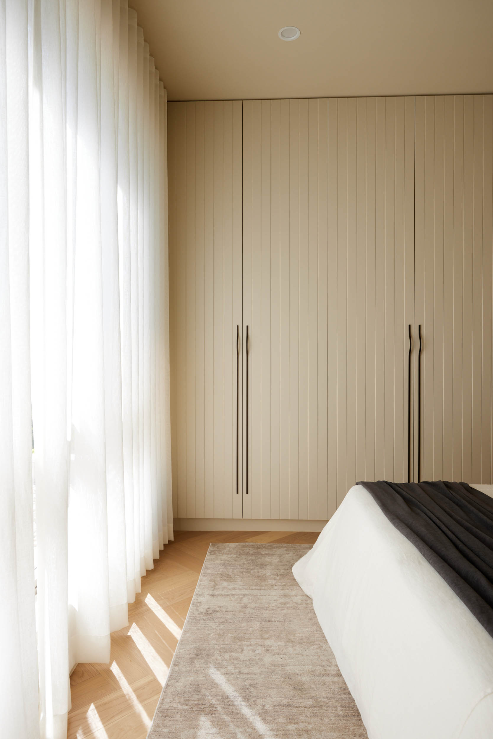 The interior is layered and contemporary, defined by warm neutral tones, timber, concrete and warm metal detailing. Dulux Grand Piano Quarter is used throughout to cocoon the home in a tranquil atmosphere. Integrated storage, sculptural lighting and tactile finishes create a calm, luxurious residence designed for modern living.