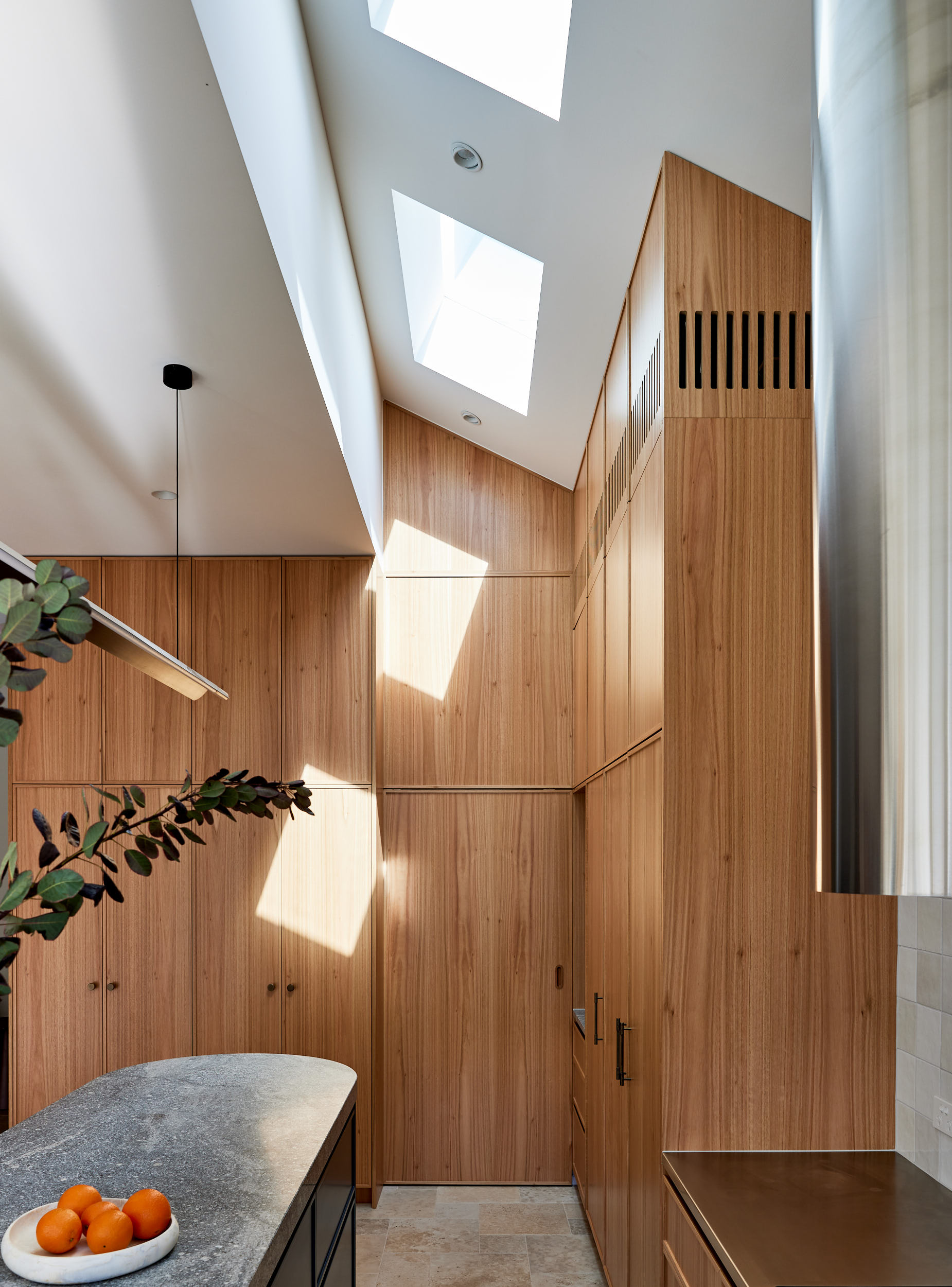The design features a warm, earthy palette elevated by natural materials like travertine, warm timber, and grey granite. Featuring premium finishes such as timber veneer cabinetry, stainless steel bench top gunmetal and aged brass accents. The outcome is a bright, textural home that mixes Federation influences with contemporary flair. Through a mix of unique profiles and offset patterns, we delivered a welcoming atmosphere defined by sophisticated, functional beauty.